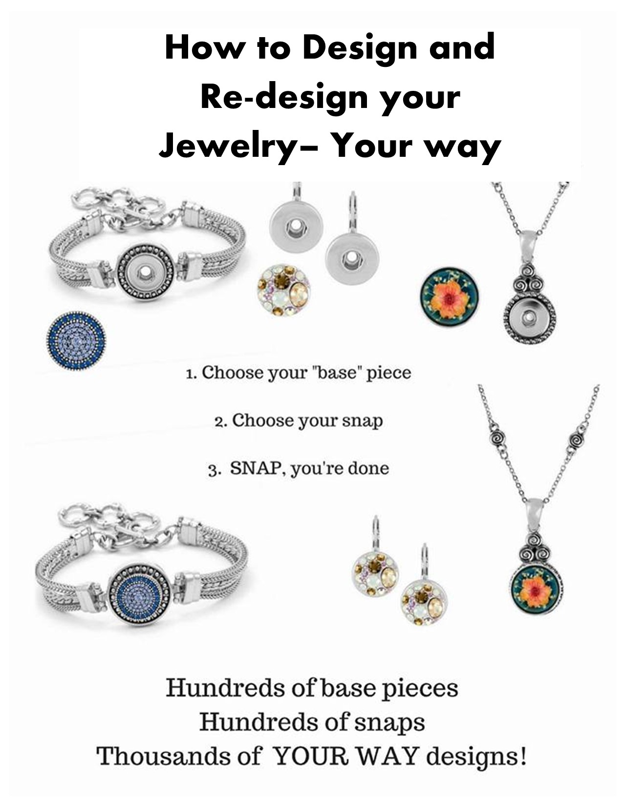 | MY STORY I immediately fell in love with the beauty, style and creative customization of Snap Jewelry. I love the different jewelry base pieces, the sparkle of the crystals and the way I could customize and change my jewelry daily by just popping off a snap and popping on a new one. I was hooked with the uniqueness and versatility. I love creating new looks everyday. I started thinking about what to wear to match the jewelry pieces I wanted to wear. Finally I could create my own unique style and look to match how I was feeling or to match the style of clothing I choose to wear. It is truly a lot of fun and takes me back to when, as a little girl, I loved to dress up and put on play jewelry and pretended to be a princess. I feel special and glamorous every day which has a wonderful boosting effect on my confidence and self-esteem when I am out in public. Come take a look and try our snap jewelry for yourself and see how fun playing with jewelry can be and how looking “put together” can really boost your confidence and self esteem….just like me! |